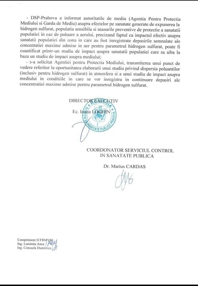 Interesant este că însăși Direcția de Sănătate Publică Prahova nu s-a lăsat intimidată de „guițătorii ecologiști” și a solicitat Asociației pentru Protecția Mediului Prahova și Gărzii Naționale de Mediu să stabilească adevărata sursă de poluare (adică, vechea groapă de gunoi și OMV Petrom). Iar Ministerul Sănătății a fost informat de aceeași Direcție de Sănătate Publică Prahova pentru a dispune eventuale măsuri.