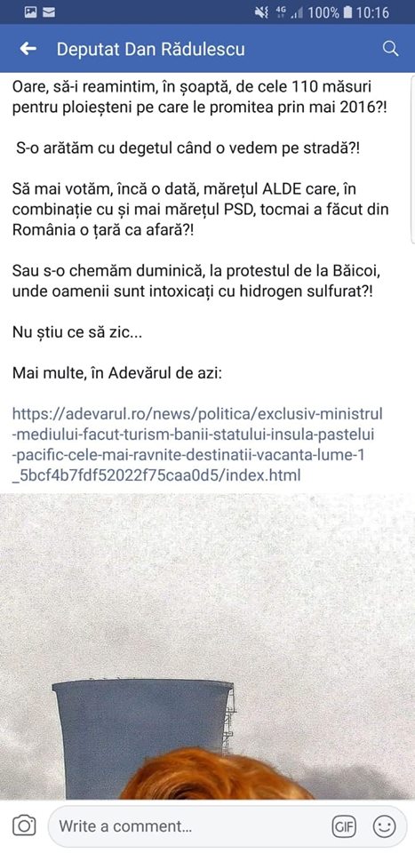 În cazul „poluării cu gunoi de la Băicoi” atât de mult trâmbițată de falșii ecologiști, indivizi politizați și „petrolizați” până în măduva oaselor care, mai nou, s-au gândit ei să facă miting „ecologic” în data de 28 octombrie 2018… o recunoaște chiar deputatul USR de Ploiești, Rădulescu Dan în postarea sa de pe FaceBook în care susține că „va aprticipa la mitingul împotriva poluării Orașului Băicoi”. „Ecologiștii” din Băicoi sunt în fibrilații pentru pregătirea mitingului politic din 28 octombrie 2018… doar USR-ul „nu-i înghite” pe cei de la PSD-ALDE… căci din ALDE face parte primarul Orașului Băicoi care „tot uită” de vechea groapă de gunoi și nu îi bagă în seamă pe falșii ecologiști care „guiță” în spațiul public că „activitatea petrolieră nu poluează ci doar Depozitul de deșeuri al societății Vitalia poluează”. Sau îi protejează chiar Primarul Băicoiului pe acești falși ecologiști? Cel puțin, falșii ecologiști din Orașul Băicoi susțin în manifestele lor că „Primăria și Consiliul Local îi susțin” (cu ce bani or fi printat manifestele? Cumva cu cei ai petroliștilor ? Sau ai primăriei? Sau ai USR-Prahova? Ori cu banii PSD-ALDE?).