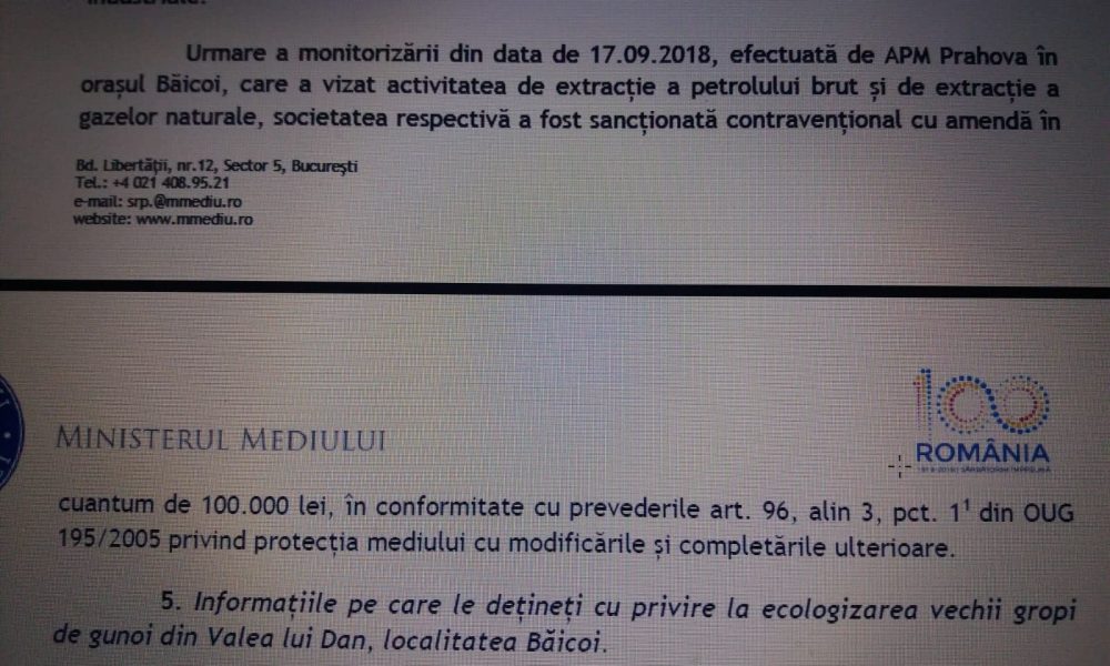 Iar Ministerul Mediului ne comunică prin adresa nr. 44671 /MD/15.10.2018 că: Urmare a monitorizării din data de 17.09.2018, efectuată de APM Prahova în orașul Băicoi, care a vizat activitatea de extracție a petrolului brut și de extracție a gazelor naturale, societatea respectivă a fost sancționată contravențional cu amendă în cuantum de 100.000 lei, în conformitate cu prevederile art. 96, alin 3, pct. 11 din OUG 195/2005 privind protecția mediului cu modificările și completările ulterioare (1. obligația persoanelor fizice de a funcționa cu respectarea prevederilor autorizației de mediu și a persoanelor juridice de a funcționa cu respectarea prevederilor autorizației/autorizației integrate de mediu pentru activitățile care fac obiectul procedurilor de reglementare din punct de vedere al protecției mediului).