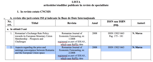 Articolul doi de unic autor este pretins publicat în aceiași revistă indexată ISI Thompson – ,,Romanian Journal of Economic Forecasting” – numărul 2/2008 și intitulat ,,Aspects reagarding the price and earnings convergence between Romania and the European Uniun Space”.