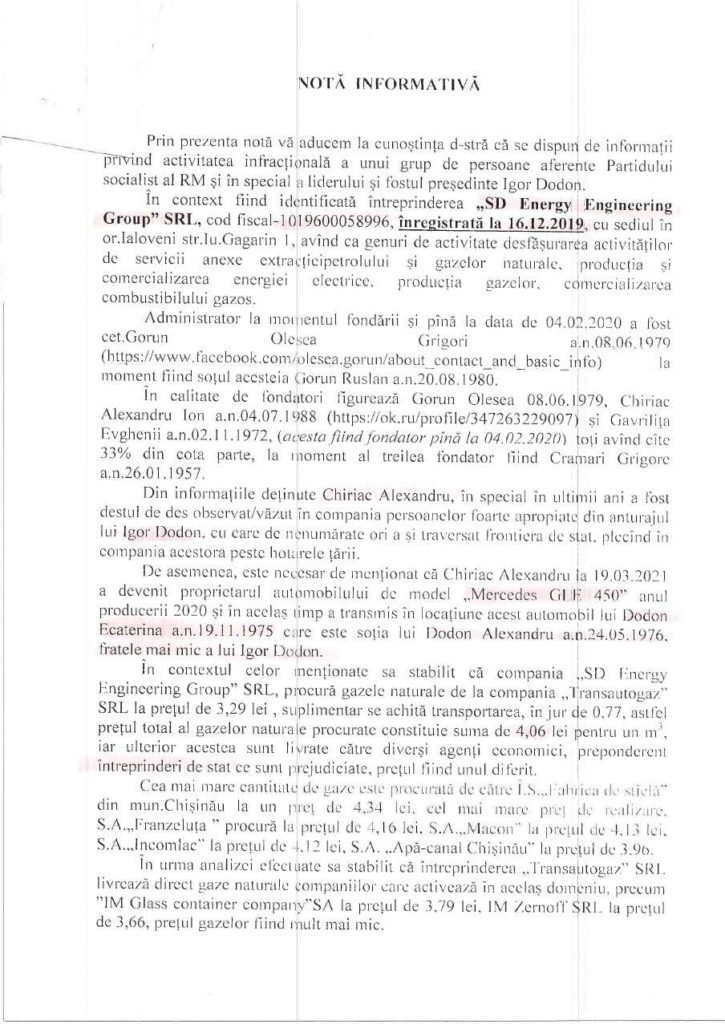 În cauză, e vorba de întreprinderea „SD Energy Engineering Group”, cu sediul în Ialoveni, controlată din umbră de fratele lui Igor Dodon. Potrivit notei informative, compania procură gaz de la „Transautogaz” SRL la prețul de 4,06 lei pentru un metru cub, inclusiv cheltuielile pentru transport. Ulterior, gazul este livrat la un preț mai mare către diverși agenți economici, preponderent întreprinderi de stat, acestea fiind astfel prejudiciate.