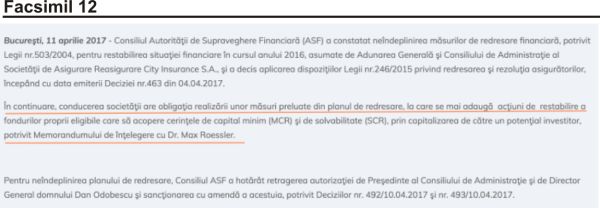 ,,Pare un faliment acoperit 5 ani (n.r. 2016-2021, din care un an şi jumătate chiar el a fost Preşedinte ASF). City a fost pus sub plan de redresare în 2016, după un audit cu Big4, solicitat de ASF. La ultima şedinţă de Consiliu la care am participat (Aprilie 2017), am decis retragerea autorizaţiei conducerii societăţii şi am hotărât desemnarea unui administrator special (FGA sau consultant auditor (???) (…) După ce am plecat eu conducea ASF-ul primul vicepreşedinte al ASF, Cornel Coca-Constantinescu. Cand au adus extrasul de cont, eu nu mai eram la ASF. (…) Nu ASF a descoperit falsul acum, ci auditorul BIG4, cu ocazia exerciţiului BIG4 solicitat de EIOPA în 2020”.