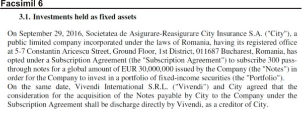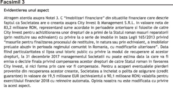 – printr-o ,,asigurare” (cel mai probabil la o societate controlată tot de grupul de interese City), în cazul în care City Invest nu va încasa de la statul român banii pe drepturile litigioase, asigurare în valoare de 90,1 milioane lei;
