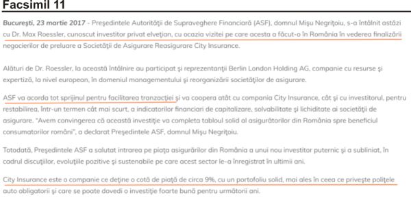 8. Validând banii inexistenţi, Mişu Negriţoiu iese public în 23 martie 2017, într-un mod total neuzual ca să garanteze pentru Max Roessler, pentru a transmite că City Insurance este o companie ,,solidă” şi să îl impună, astfel, ca viitor acţionar pe ,,investitorul” Max Roessler, aşa cum arată comunicatul ASF din 23 martie 2017.