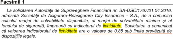 1. Mişu Negriţoiu a mângâiat pe creştet City Insurance, companie care în 2015 avea o cotă de piaţă pe asigurările RCA de doar 10,4%. În aprilie 2016, Mişu Negriţoiu constată, prin decizia ASF nr. 901 , că City Insurance nu respectă indicatorii de lichiditate şi capital, aceştia fiind subunitari, măsură care se impunea, fiind numirea unui administrator special şi nu mângâierea pe creştet. Prin decizia 901, Mişu Negriţoiu şi ASF ascund faptul că City Insurance nu respectă cerinţele minime de capital, referindu-se doar la valoarea indicatorului de lichiditate.