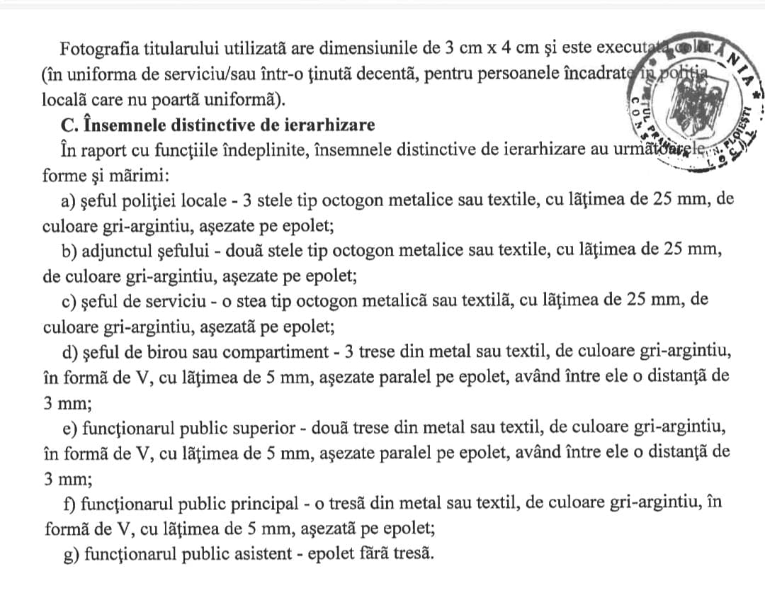 - Seful politiei locale – 3 stele tip octogon metalice sau textile, cu latimea de 25 mm, de culaore gri-argintiu, asezate pe EPOLET;…