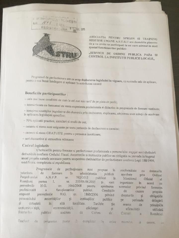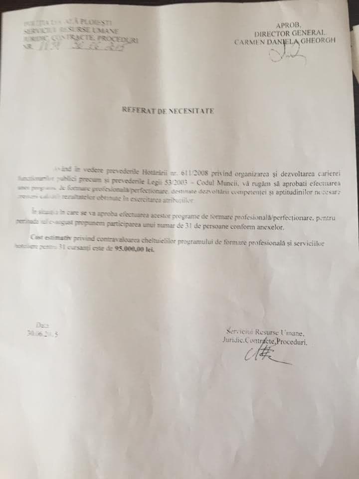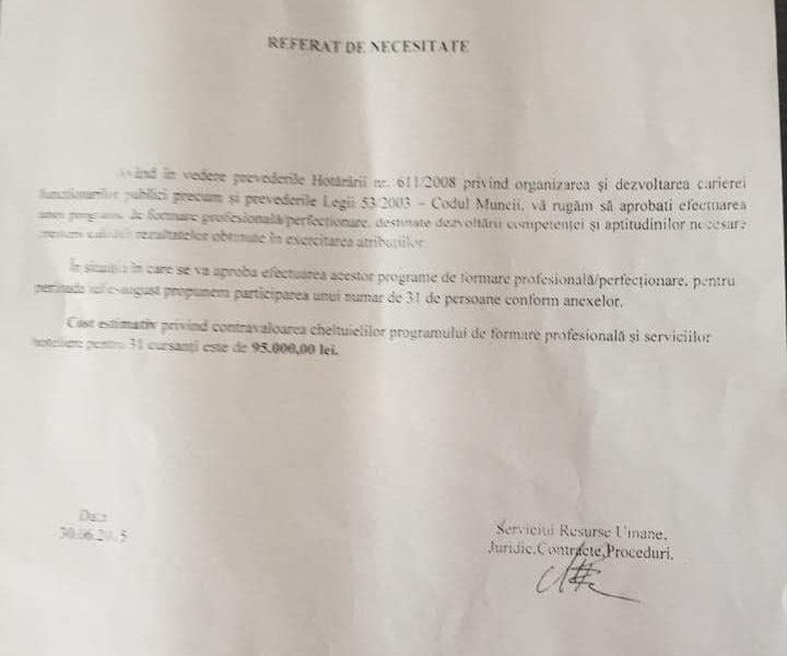Reamintim ca, prin REFERATUL DE NECESITATE nr. 1098 / 30.06.2015, semnat indescifrabil pentru sef Serviciu resurse umane, juridic, contracte, proceduri, s-a solicitat si obtinut aprobarea pentru efectuarea de catre 31 cursanti, in perioada iulie – august 2015 (cu mentiunea „conform anexelor”) a “unor programe de formare profesionala/perfectionare, destinate dezvoltarii competentei si aptitudinilor necesare cresterii calitatii rezultatelor obtinute in exercitarea atributiilor”.