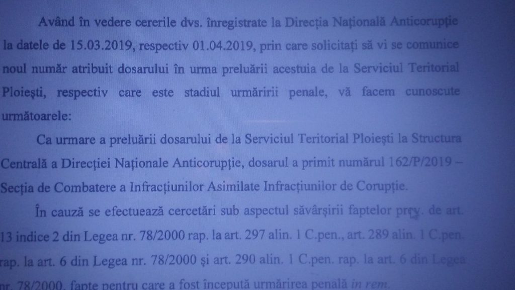 Cauza s-a aflat pe rolul DNA – Serviciul Teritorial Ploieşti şi a facut obiectul dosarului nr. 255/P/2015 în care s-a început urmărirea penală in rem , fiind practic tinut la sertar la interventiile procurorului Negulescu Mircea.