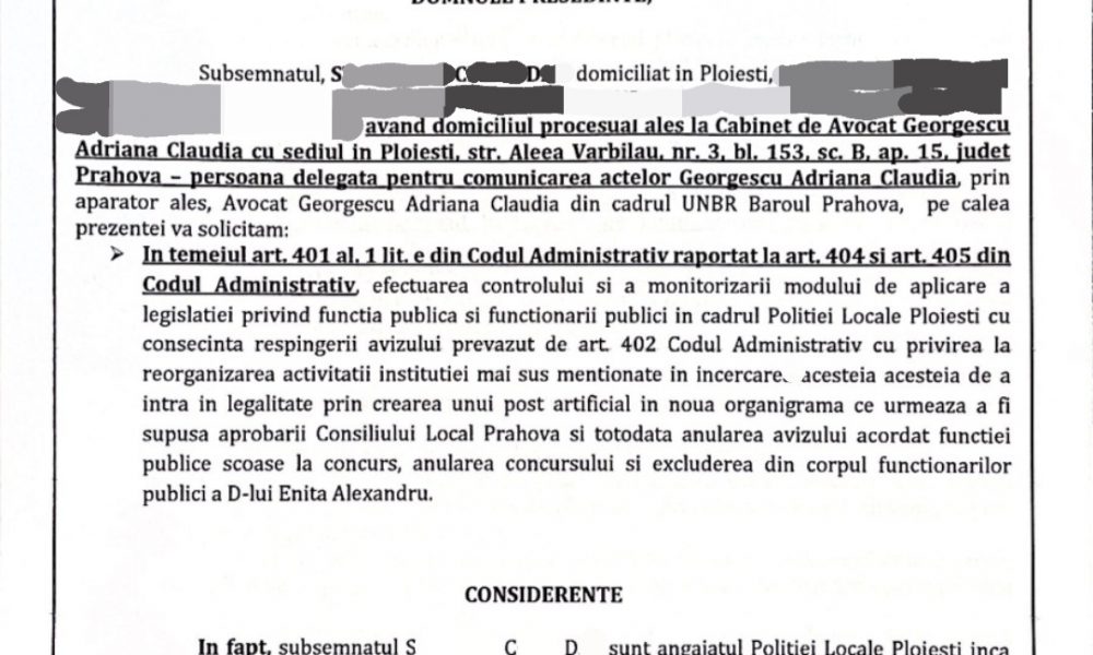 ANFP a fost sesizata, prin Cabinet Avocat, cu privire la ilegalitatile de la Politia Locala Ploiesti/Se solicita excluderea din corpul functionarilor publici a lui Enita Alexandru