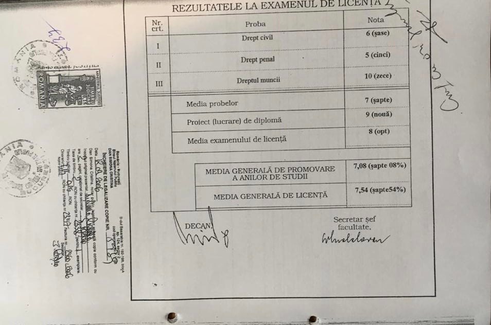 Examenul de licență în Drept l-a susținut la Universitatea „Babeș-Bolyai” din Cluj-Napoca în februarie 1996, pentru că „Spiru Haret” nu era acreditată și nu avea dreptul de a organiza examene de licență.