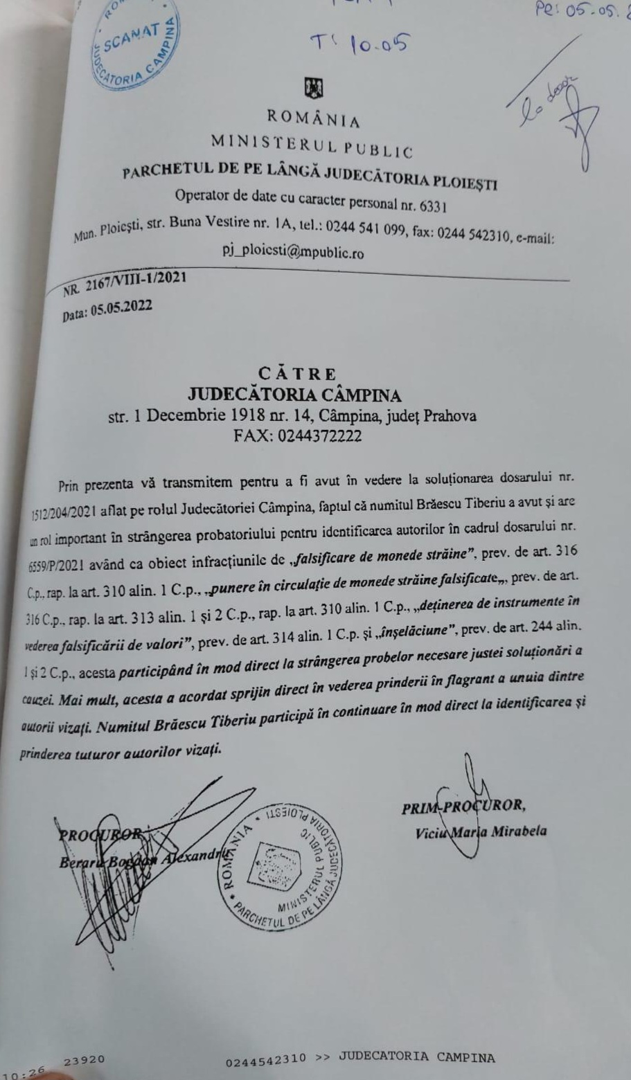 La data de 05.05.2021, Parchetul de pe langa Judecatoria Ploiesti trimite o adresa (nr 2167/VIII-1/2021) catre Judecatoria Campina, in dosarul nr 1512/204/2021.