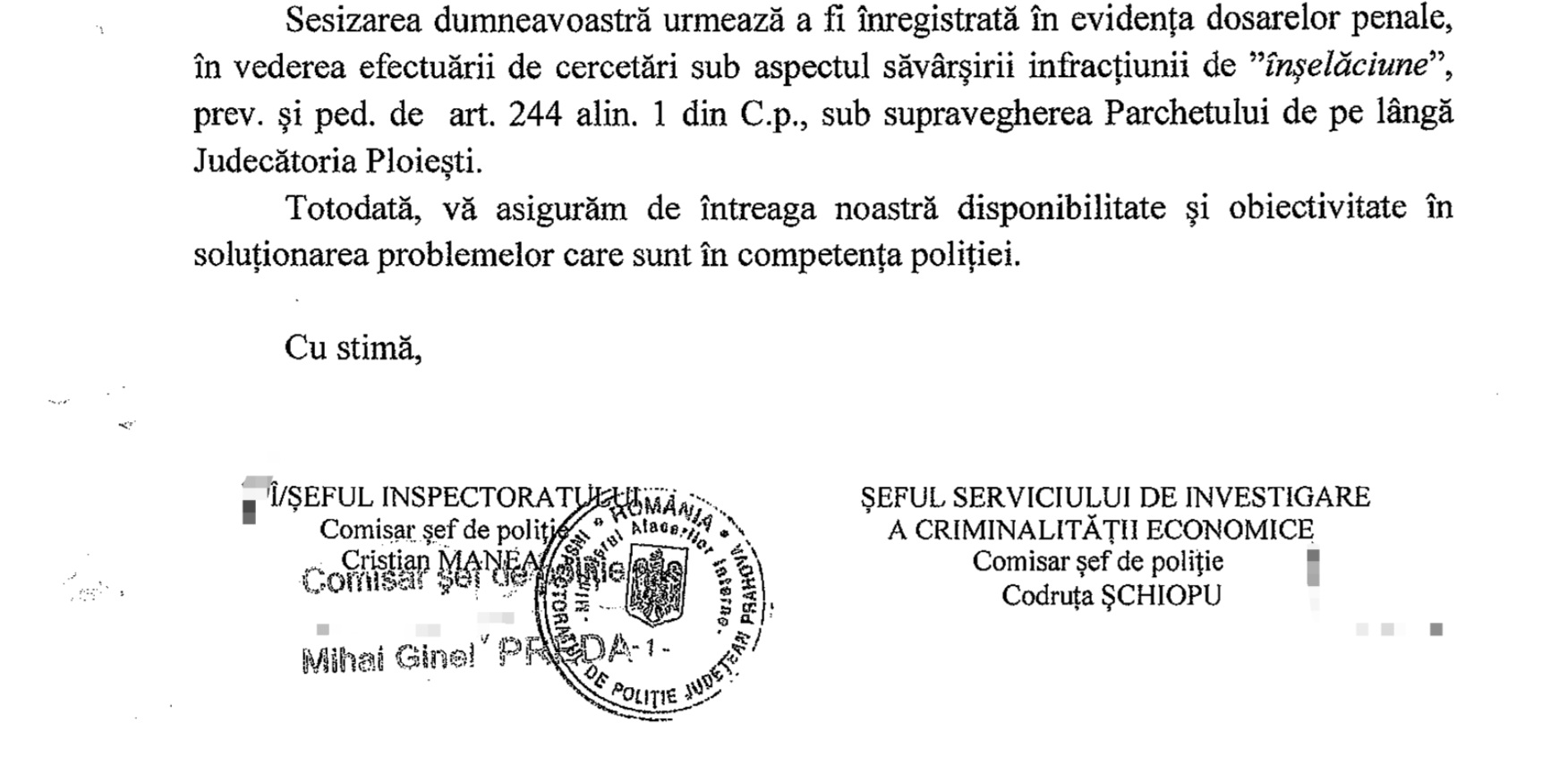 Va dezvaluiam ca, cercetarea s-a efectuat de politsiti din IPJ Dambovita deoarece existau suspiciuni rezonabile ca eterna coruptie bantuie pe holurile IPJ Prahova.Iata ca, sub protectia lui Ginel Preda gruparea de criminalitate economico-financiara organizata a fost luata pe nepregatite.