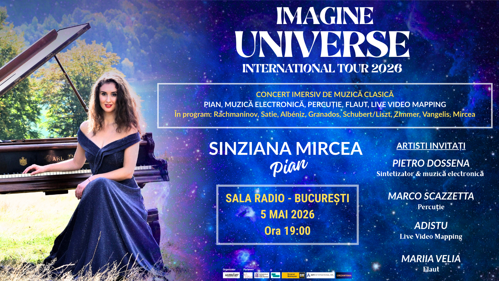 Pian, percuții, flaut, muzică electronică și live video mapping se vor reuni într-o nouă serie de concerte imersive de muzică clasică în cadrul „IMAGINE Universe” TOUR 2026, sub semnătura inconfundabilă a pianistei și compozitoarei române Sînziana Mircea, solista seriei de concerte.